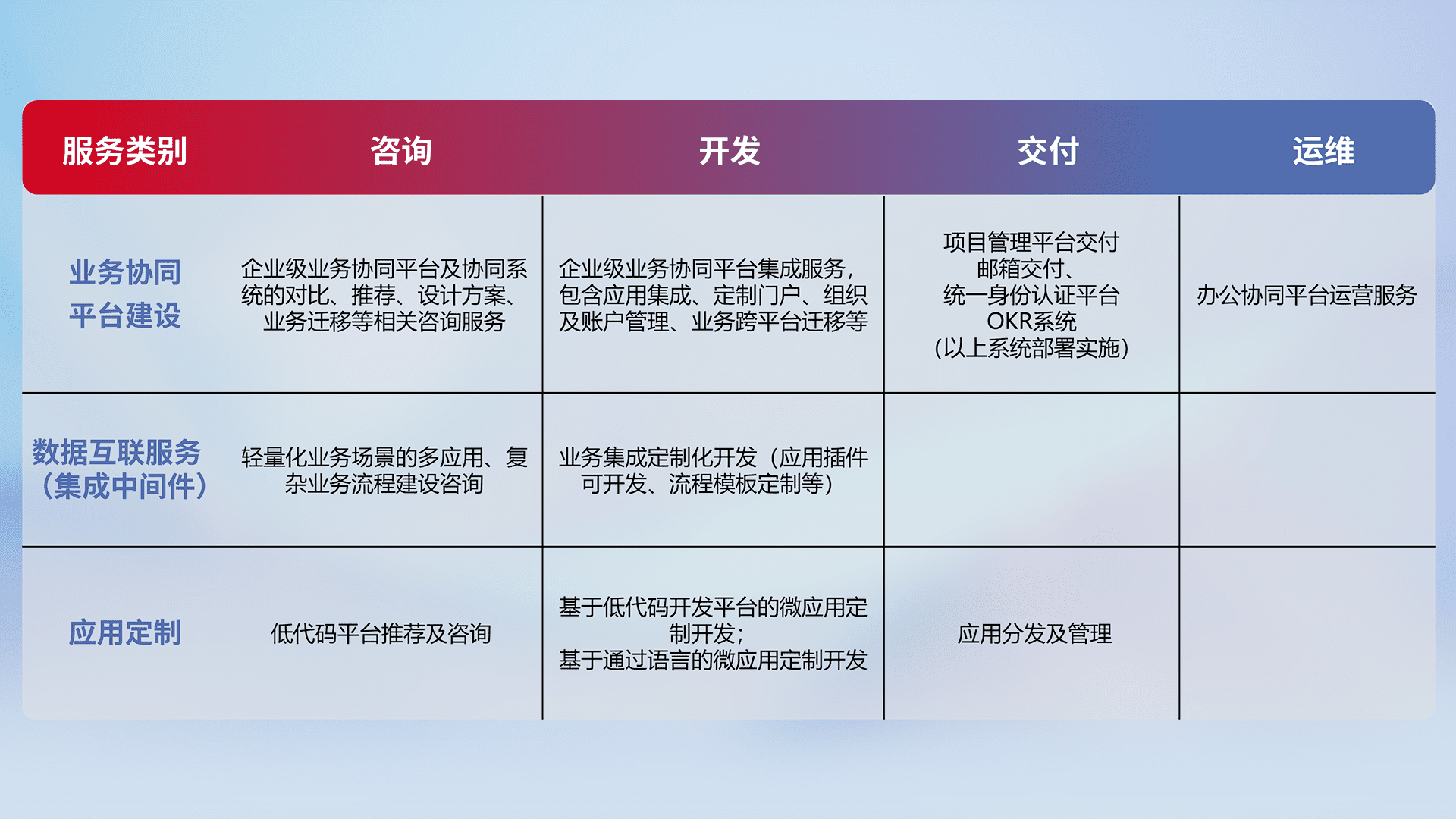 针对钉钉、、、企微、、、、IDaas等平台级产品提供产品的规划、、方案、、、交付、、、、定制化开发等服务,,,,实现如统一协同办公、、智能客户服务、、、混合会议管理、、、智能数据查询、、等业务场景,,实现数字化转型。。。