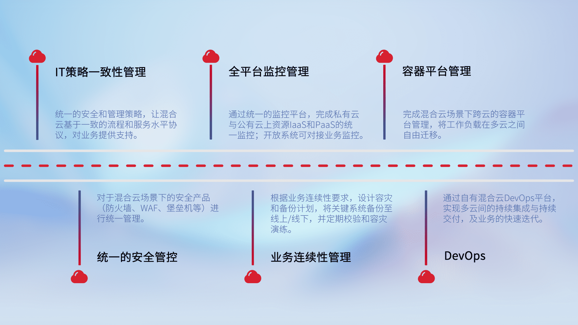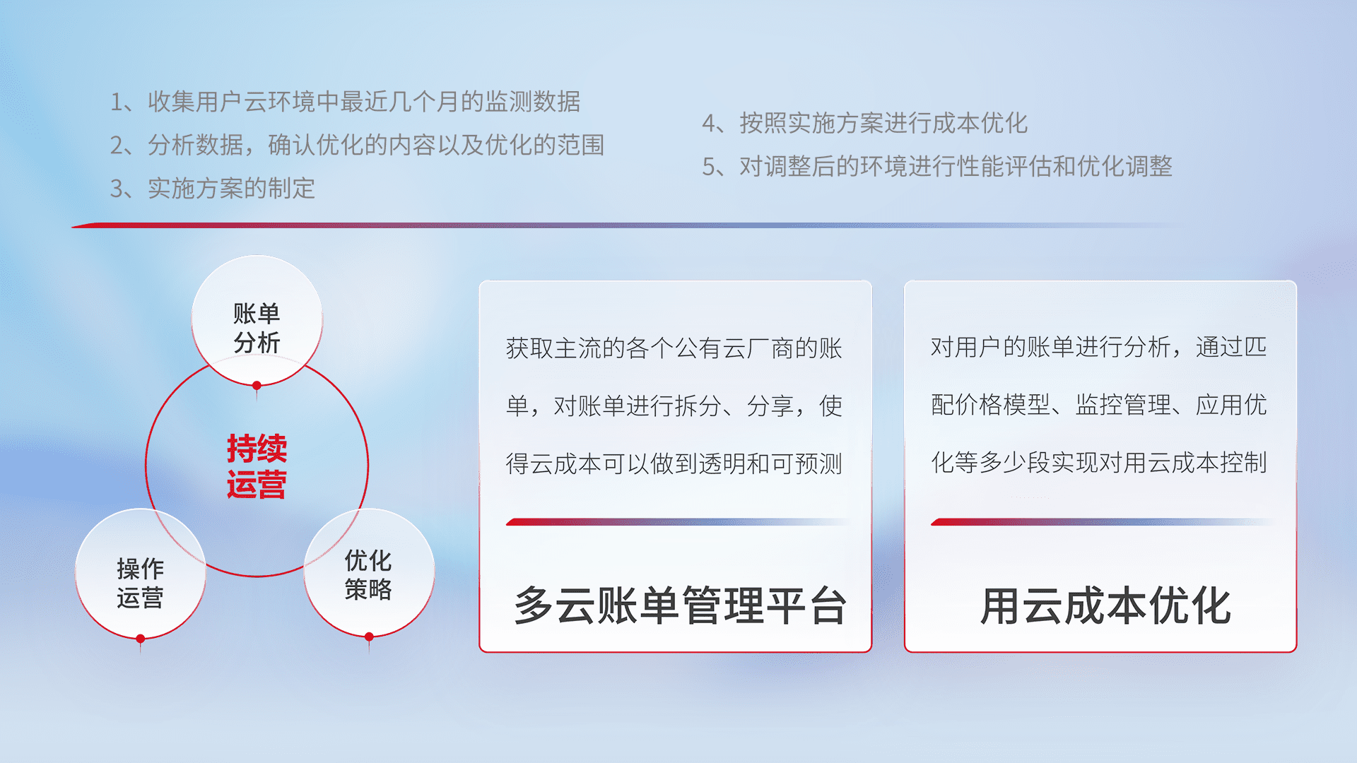 通过多云纳管,,,以统一的资源数据模型把客户的云资源进行抽象和封装,,,进而实现对多云资源的统一操作,,,,保障云资源管理的可靠性、、、稳定性与可用性。。。量身定制化运维内容,,,配置、、、、开发运维、、、补丁管理、、备份、、、、监控、、、、认证和访问管理、、、、审计和日常巡检等,,保障在用云过程中的可靠度,,,稳定度以及高可用率。。。。