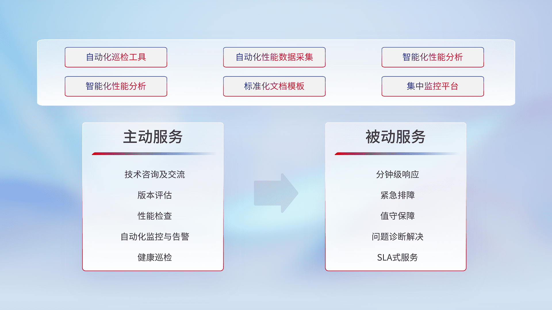 智能化工具和标准化文档,,,保障服务质量,,提供主动服务(包含技术咨询、、版本评估、、、性能检查、、、自动化监控与告警、、健康巡检)和被动服务包含(分钟级响应、、、、紧急排障、、值守保障、、、问题诊断解决、、SLA服务)。。。。