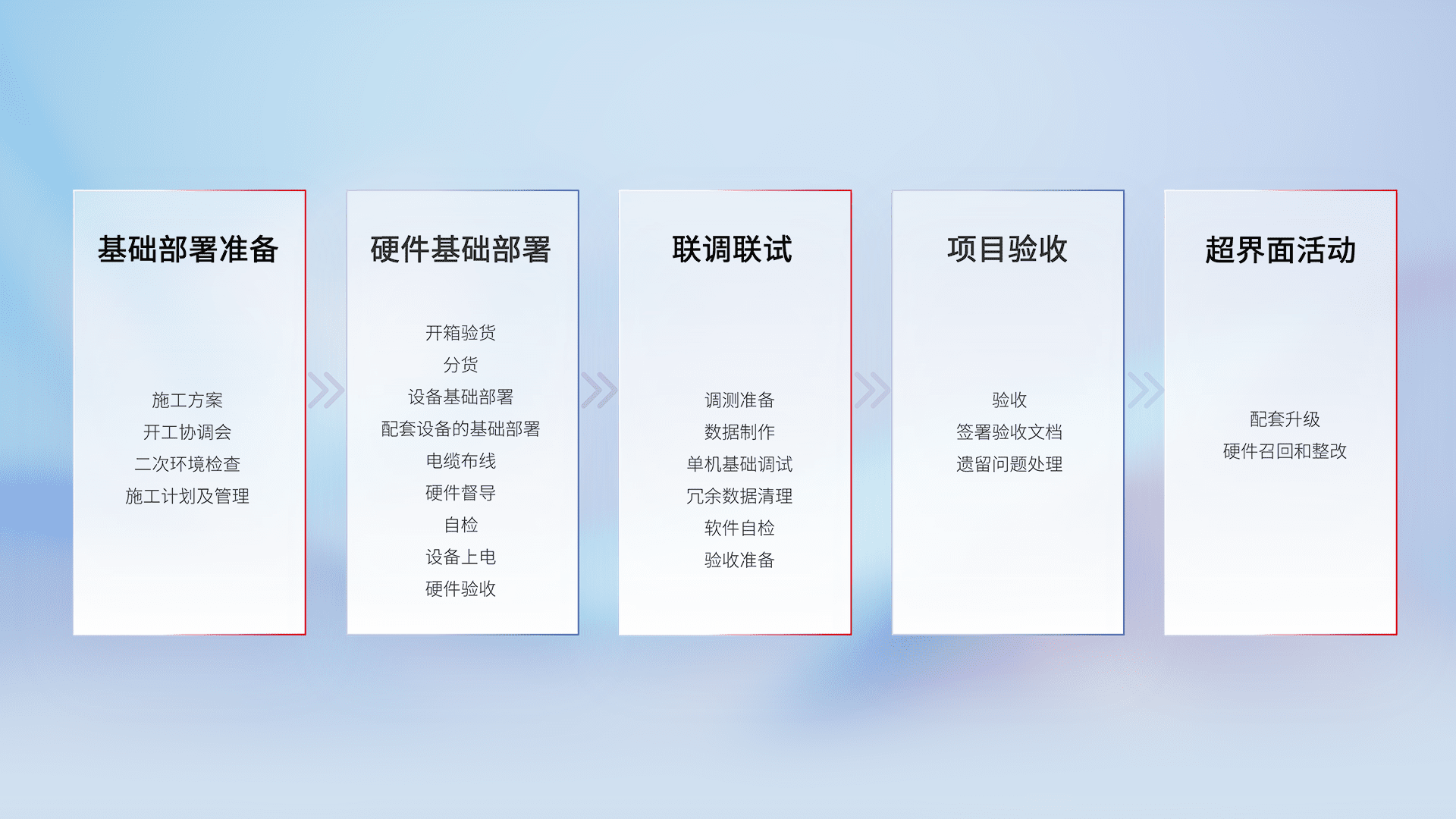 从基础部署准备、、、、硬件基础部署、、、、联调联试、、、、项目验收、、、、越界面活动的全过程可追溯,,,,保证施工质量和进度。。。。